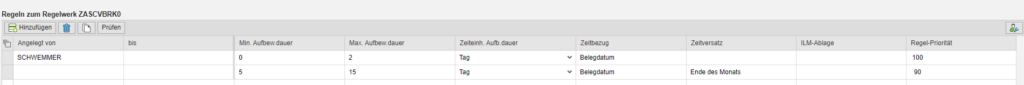 - Die Aufbewahrungsregeln: Sie bestimmen, wie lange Daten (ggf. bereits archiviert) gehalten werden müssen bzw. maximal gehalten werden dürfen (Datenschutz).