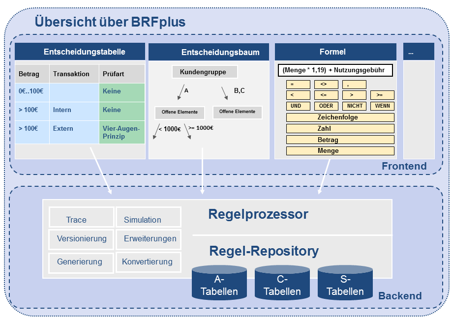 Das Rules Repository befindet sich auch im Backend und dient als Sammelstelle der definierten BRFplus-Objekte. Hier werden die einzelnen Geschäftsregeln in Formeln, Entscheidungsbäume und Entscheidungstabellen abgelegt.